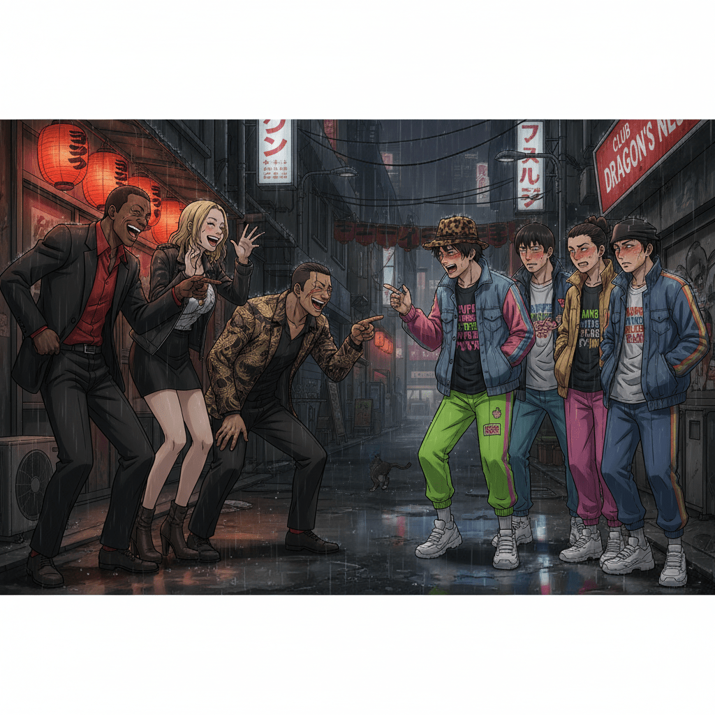 Say your rival crew rolls up wearing some wack-ass, cheap-looking suits. You see ’em and you just can’t help but laugh (笑わずにはいられない).